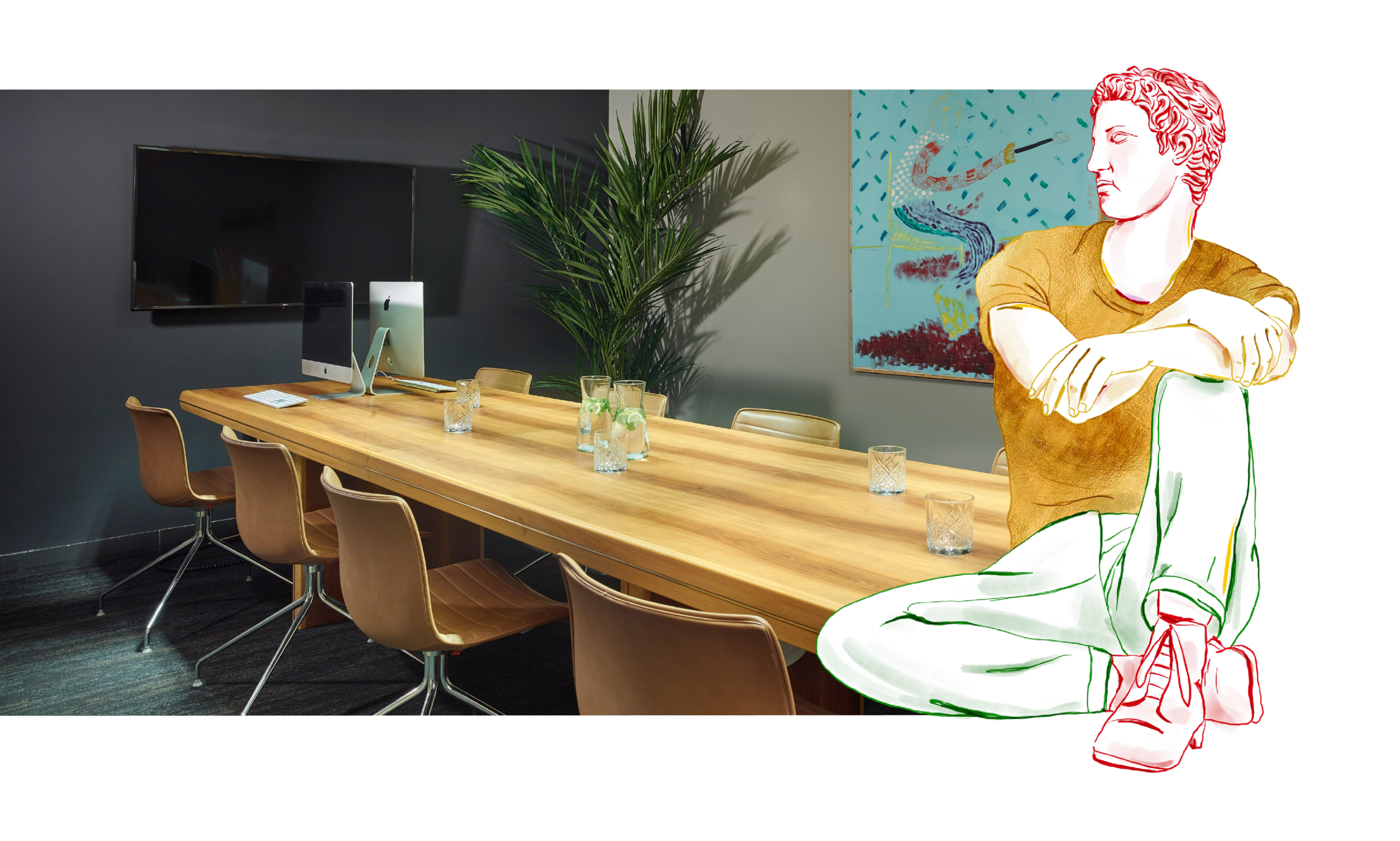 For private business assemblies, gather around an inspiring and historic meeting table in The Icon Prague Hotel Meeting Room. Originally part of the famous BATA shoe factory in Zlin, which was renowned for its innovative production and management standards, the long wooden table comfortably seats up to ten people. Equipped with a 55″ Smart TV, flipchart, and high speed Wifi, this space caters to all of your professional requirements.